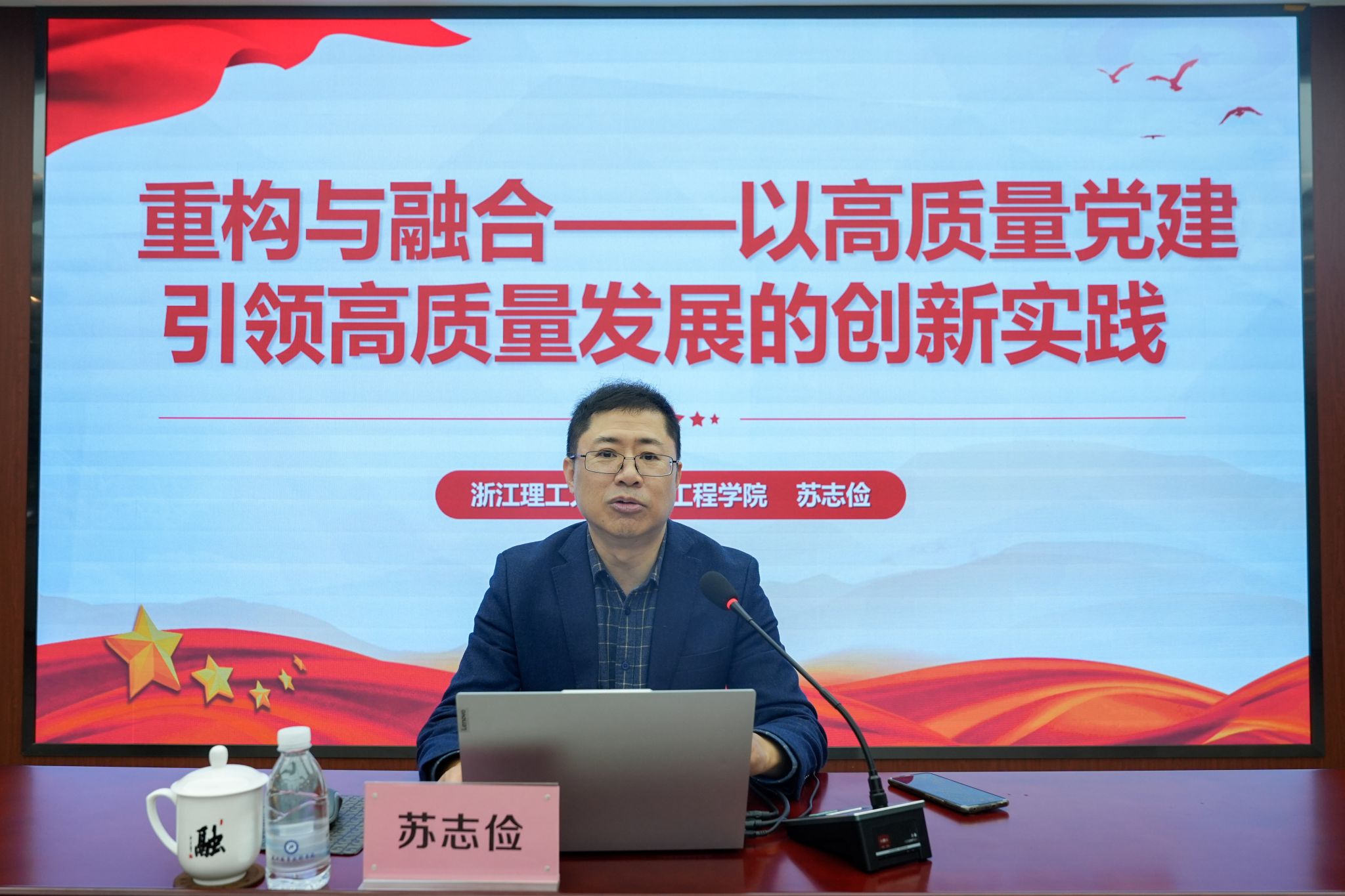 浙江理工大学机械工程学院党委书记苏志俭以《重构与融合——以高质量党建引领高质量发展的创新实践》为题,介绍所在学院的党建工作优秀经验和特色做法,为各二级学院党组织有效落实党建“强院行动”,提升党建和业务工作的融合水平提供了细致指导。