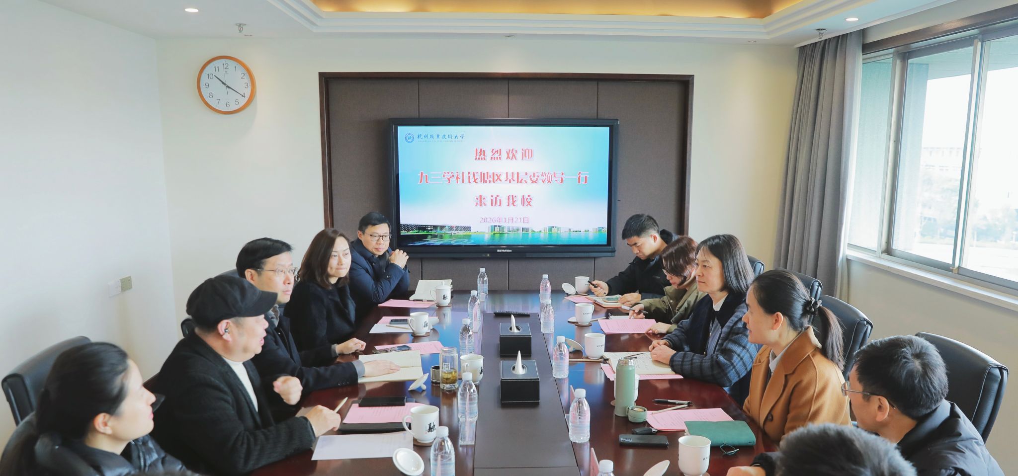 1月21日上午,钱塘区政协副主席、九三学社杭州市钱塘区基层委主委张海平一行来校调研,钱塘区委统战部常务副部长戎婷蓉陪同。学校党委副书记赖明诚、校党委统战部负责人、校九三学社社员代表等参加座谈。双方围绕深化校地企合作、推进人才共育等深入交流。